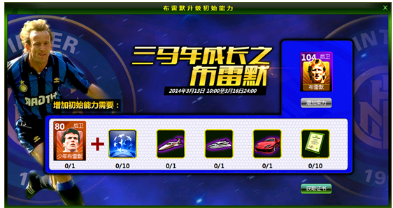 活动内容:在活动期间,玩家在活动界面内集齐一系列数量的道具就会点亮“增加实力”按钮,使当前玩家球队中的布雷默增加1点初始能力。