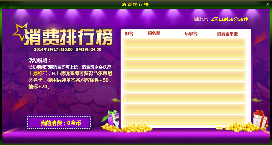 活动期间,全区全服的玩家只要消费金币就能上榜。消费排行榜活动在3月19日22:00结束,3月19日24:00发奖。