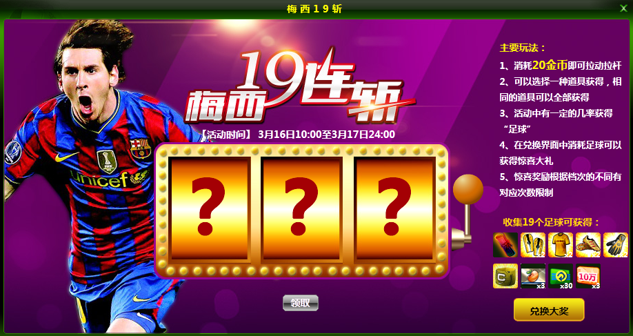 1、玩家参加梅西十九连斩活动费用为20金币/次。如随机摇出3种不同道具,玩家可领取其中一款道具;如随机摇出两个以上相同道具,玩家可选择将相同的道具全部领取。