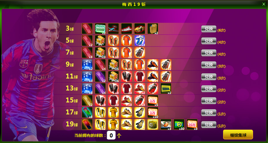 9球奖:欧冠之魂*2,合同5级*4,银币兑换包(中)*5,4级护腿*4,4级战袍*4,4级战靴*2,4级手套*2。每人每天可兑换3次。