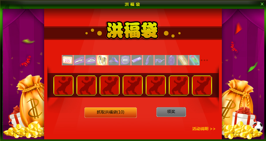 活动内容:活动期间内,快来“抓取洪福袋”!仅需30金币就可以开启洪福之旅,抓得洪福袋点亮道具奖励,更有8级合同,欧冠之魂,8级高教装备等众多豪礼呢~心动不如行动,快来抓洪福袋!