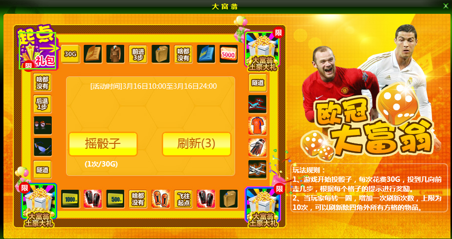 活动内容:在活动期间内,玩大富翁仅需消耗30金币即可掷1次骰子,骰子显示几点就走几步。各种妙礼遍布在你的大富翁梦想之路上。大富翁角落大奖除了起点礼包,其余三个角落大奖每个角都有1-9级合同,高级教练合同10级,巅峰回豆卡*5,白金钥匙*10,回豆卡*8,立即返还卡*30,成长证书*4。