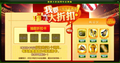 活动内容:在活动期间,玩家参与“我要大折扣”,每个活动日有10次免费抽折扣卡的机会,免费购买卡在等你抽!玩家使用抽到的折扣卡上的折扣来购买活动界面中的道具。如果免费抽折扣卡的机会用完,还可以使用金币来抽折扣卡哟~6款道具等你来超值享受,不仅有0.1折卡,更有免费卡让你痛痛快快买道具!
