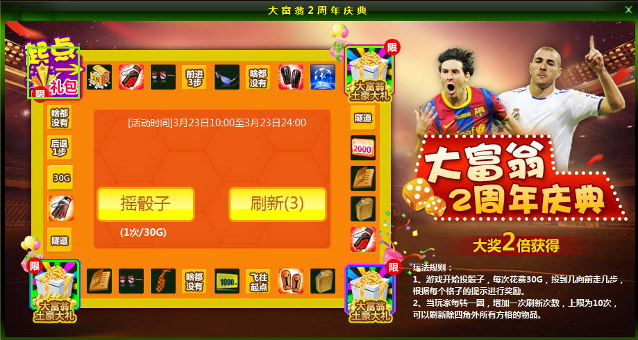 活动内容:在活动期间内,玩大富翁仅需消耗30金币即可掷1次骰子,骰子显示几点就走几步。各种妙礼遍布在你的大富翁梦想之路上。大富翁角落大奖除了起点礼包,其余三个角落大奖每个角都有1-9级合同,6级装备套,6级袖标,1-10级高教合同,巅峰回豆卡*5,重翻次数卡*10,立即返回卡*10。玩家每次走到角落大奖时,所获得的礼包数*2(含起点礼包)!