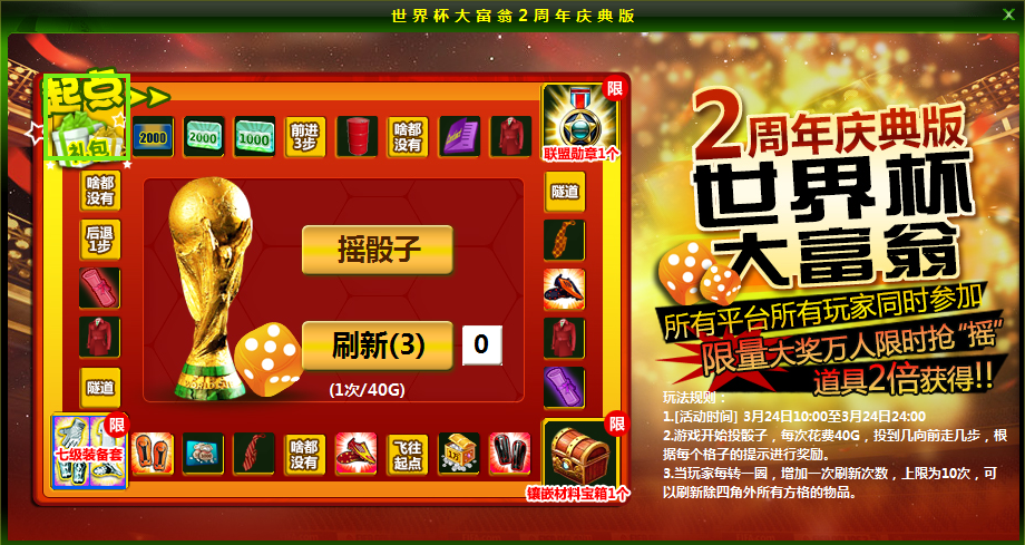 活动内容:在“世界杯大富翁”活动期间内,您仅需消耗40金币即可掷1次骰子,骰子显示几点就走几步。在世界杯大富翁之路上,除了有起点礼包,更有2倍获取全区全服限量投放的联盟勋章1个,镶嵌材料宝箱1个,7级装备套1个(不含袖标)哟! 全区全服限量的超级大礼,你一定不能错过机会。