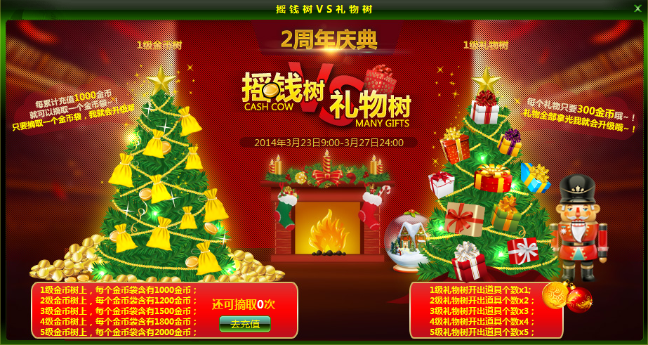 活动内容:活动期间,在活动界面中一棵为金币树,一棵为礼物树。金币树上有金币袋,玩家累计充值满1000金币就可以摘取一个金币袋哟;礼物树上有小礼物,玩家花费500金币摘取礼物。摘取次数有限,属于小伙伴儿们的精彩,不可错过哟~