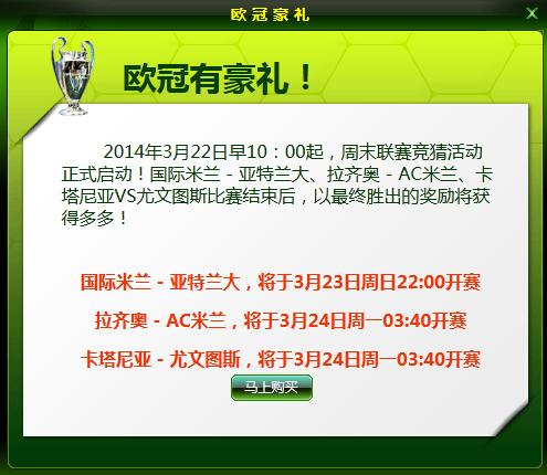 活动内容:活动期间内,玩家在商城内即可购买本场赛事礼包,在卡塔尼亚VS 尤文图斯的比赛结束后,以最终胜出的球队礼包中所含物品将翻倍!最低仅需19金币呢!超值、限时、限量购买,不容错过!