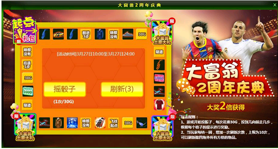 活动内容:在活动期间内,玩大富翁仅需消耗30金币即可掷1次骰子,骰子显示几点就走几步。各种妙礼遍布在你的大富翁梦想之路上。大富翁角落大奖除了起点礼包,其余三个角落大奖每个角都有1-9级合同,6级装备套,6级袖标,白金宝箱*2,国王领带10级,狂人风衣10级,爵士眼镜10级,6级汽车,6级游艇,6级飞机,成长证书*5。玩家每次走到角落大奖时,所获得的礼包数*2(含起点礼包),角落大奖不限领取次数!