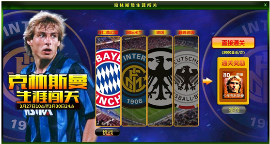 若通关则奖励少年克林斯曼的签约权。每赢一场比赛进行翻牌,翻牌奖励内容有:6级合同,成长证书,银币兑换包(中),欧冠之魂。第一次翻牌免费,第二次翻牌消耗60金币,第三次翻牌消耗100金币,第四次翻牌消耗300金币。