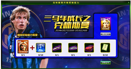 活动内容:在活动期间,玩家在活动界面内集齐一系列数量的道具就会点亮“增加实力”按钮,使当前玩家球队中的克林斯曼增加1点初始能力。