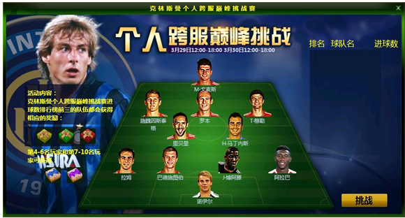活动内容:在活动期间,球会巅峰挑战赛之克林斯曼为单平台跨服赛。玩家点击“挑战”按钮即可进行挑战,玩家亦可使用鼓舞来进行挑战。