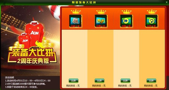 活动内容:在活动期间内,VIP功能的玩家一定要来参与限量装备大比拼活动。把自己6级、7级、8级限量装备拿出来炫耀一下,只需5000银币就可以报名比拼喽~谁的限量装备能夺得排行榜第一呢?榜首第一者奖励银币双倍卡、回豆卡、立即返回卡、跳过次数卡,还有专属球队头像及上线提示呢~
