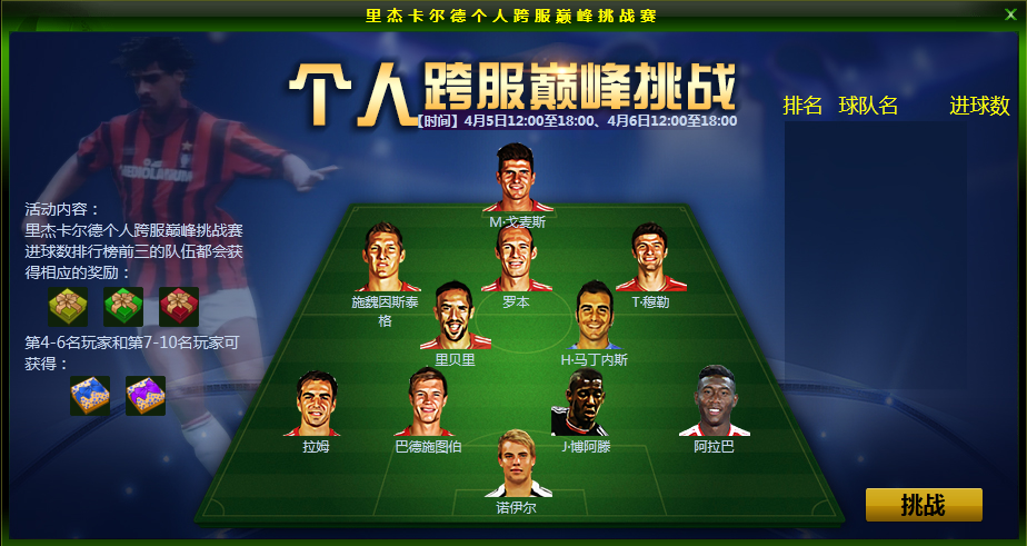 温馨提示:挑战排名每5分钟同步一次。本活动对球会无进球贡献的玩家不会有任何奖励。