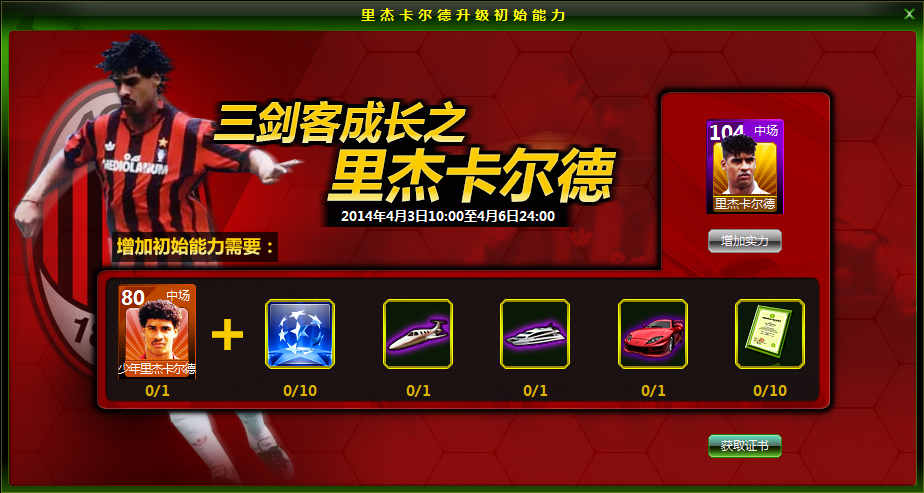 活动内容:在活动期间,玩家在活动界面内集齐一系列数量的道具就会点亮“增加实力”按钮,使当前玩家球队中的里杰卡尔德增加1点初始能力。