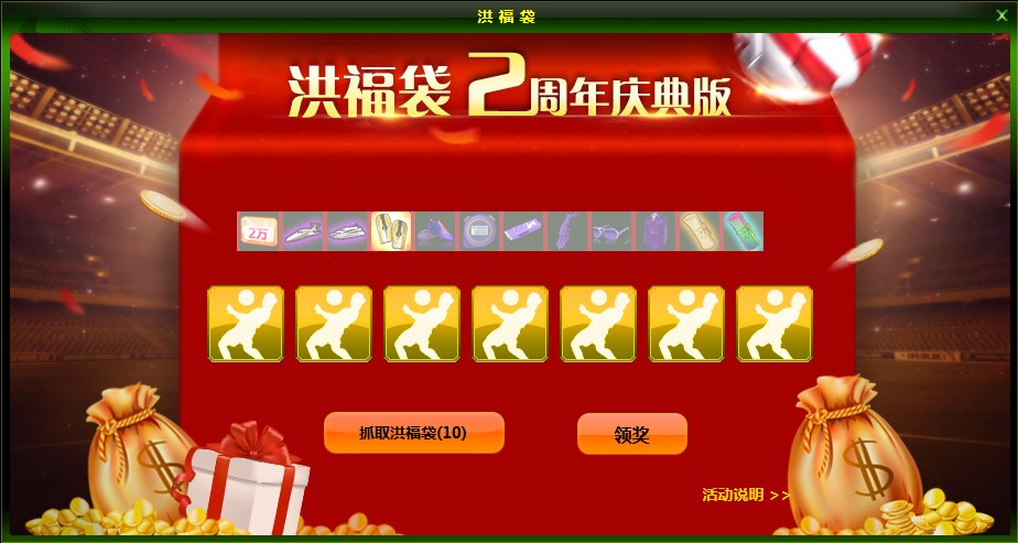 活动内容:活动期间内,快来“抓取洪福袋”!仅需50金币就可以开启洪福之旅,抓得洪福袋点亮道具奖励,更有8级合同,欧冠之魂,8级高教装备等众多豪礼呢,道具均为2倍获得~心动不如行动,快来抓洪福袋!