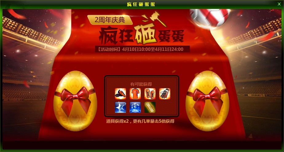 活动内容:在活动期间内,我们一起疯狂砸蛋蛋。在活动界面中,两颗超大金蛋在眼前,玩家每次任选一颗蛋把它砸开,如果砸开的是道具材料立马领取,像7级合同、欧冠之魂、球员经验卡、限量积分、战术积分等等诸多道具有可能被你砸出来哟~玩家每天第一次砸蛋是免费的哟,此后每砸一次只需消耗20金币呢~