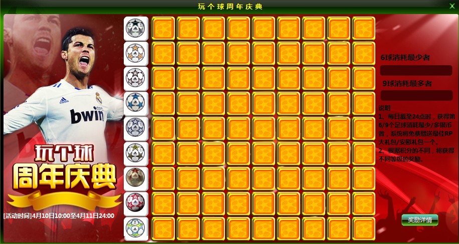 3、活动期间,每活动日截止24:00时,翻得第6个球消耗最少银币者,系统将免费赠送最佳RP大礼包,礼包内含:7级合同一个,5级装备套一套,战术积分卡10000点。同时,获得第9个球消耗最多银币者,系统将免费赠送消费礼包,礼包内含:球员经验卡10000点,训练卡100000点,战术积分卡10000点,袖标5级*1。最佳RP礼包及消费礼包会直接发放到符合条件的玩家背包中。