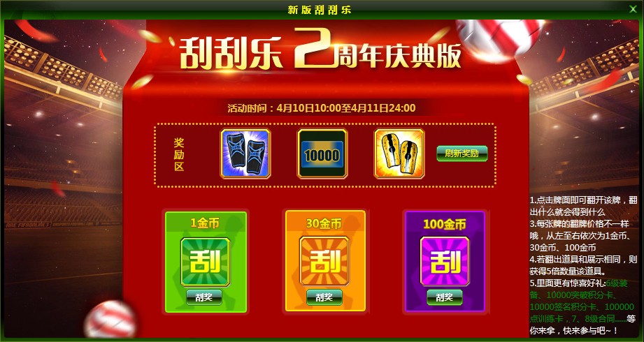活动内容:在活动期间内,来刮刮乐翻牌,玩家最低仅需1金币就可以参与刮奖,好运连连刮得道具材料尽收囊中~合同8级,6级装备,6级袖标,世界杯积分卡2000点,突破积分卡10000点,战术积分卡10000点,训练卡100000点等你来刮,刮开直接发奖励,更有获得5倍道具的机会哟~快来参与吧~!