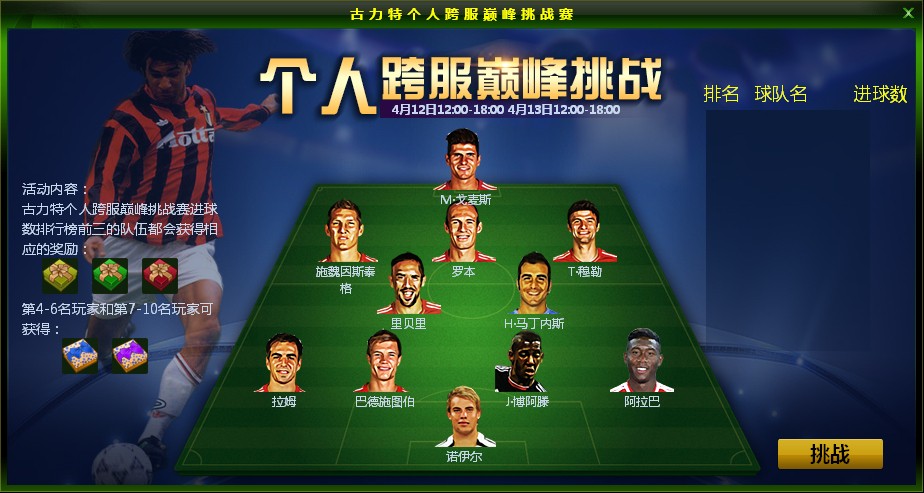 活动内容:在活动期间,球会巅峰挑战赛之古力特为单平台跨服赛。玩家点击“挑战”按钮即可进行挑战,玩家亦可使用鼓舞来进行挑战。
