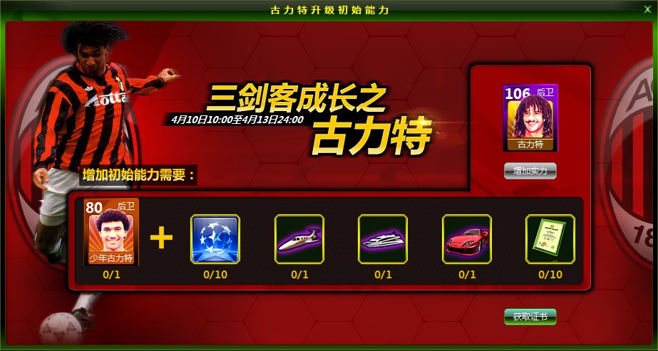 活动内容:在活动期间,玩家在活动界面内集齐一系列数量的道具就会点亮“增加实力”按钮,使当前玩家球队中的古力特增加1点初始能力。