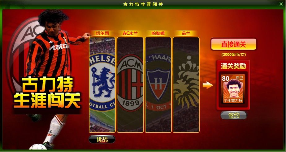若玩家通关一次后,可点击“直接通关”按钮直接通关,并获得成长证书*20、欧冠之魂*20、6级汽车*3、6级轮船*3、6级飞机*3、少年古力特*3(直接发球员,请务必预留替补席空位)且刷新球员签约、副本挑战进度,每次直接通关消耗2000金币。