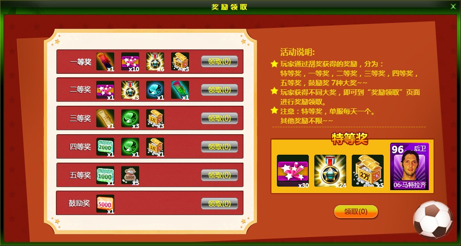 特等奖内含:06·马特拉齐(乃兑换传奇齐达内的条件球员,直接发球员,请务必预留替补席空位),好运卡*30,联盟勋章*24,银币包(大)*5。