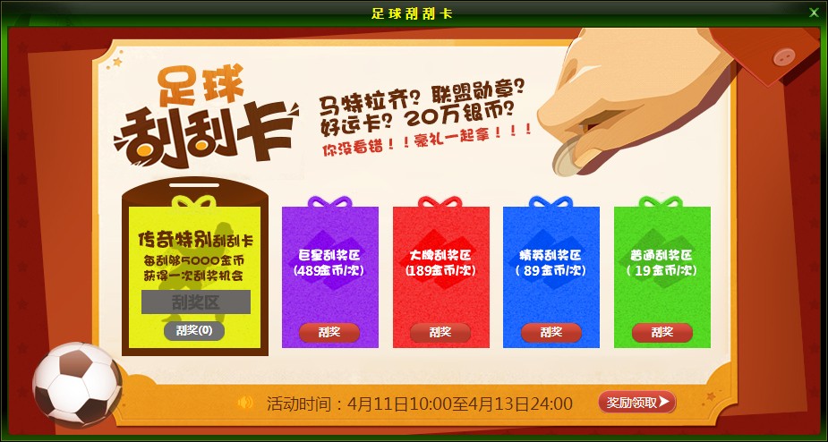 传奇特别刮刮卡:当玩家在刮刮乐活动中,只要累计消耗金币量达到5000金币单位时,获得一次刮该卡的机会。