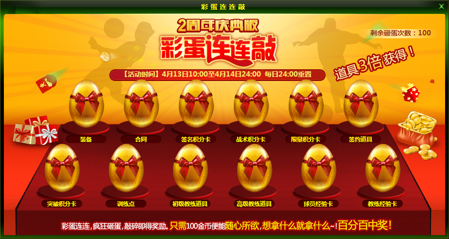 玩家每敲一颗蛋需要100金币,每个活动日每人最多只能敲100次,每次砸蛋奖励3倍道具。每个活动日的24:00进行重置。