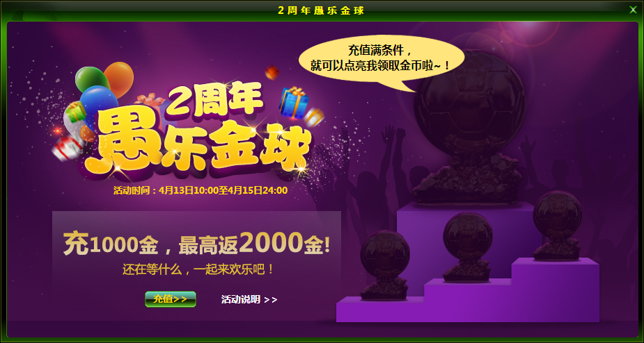活动内容:在为期三个活动日的“愚乐金球”活动中,玩家每天单笔一次性充值大于等于1000金币就可以点亮一个小金球,点亮小金球就可以有权限领取大金球的金币返还权限,单次最高能返你2000金币呢~!这样的充值钜惠绝对乐开怀,骚年,就让金球来愚乐你一番吧~