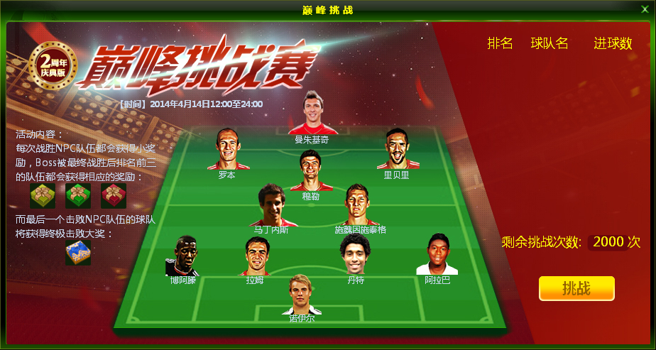 活动内容:活动期间,玩家参与“巅峰挑战赛”活动,即可挑战拜仁慕尼黑,获胜即可获得银币、训练点和声望,每日单服达到2000场胜场的时候,根据进球数量对玩家进行排名,前三名玩家有神秘礼包,更有一份终极击败大奖献给单服取得第2000场胜利的玩家,机会难得,快来挑战吧。