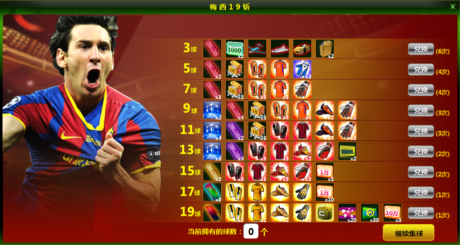 9球奖:欧冠之魂*2,合同5级*4,银币兑换包(中)*5,4级护腿*4,4级战袍*4,4级战靴*2,4级手套*2。每人每天可兑换3次。