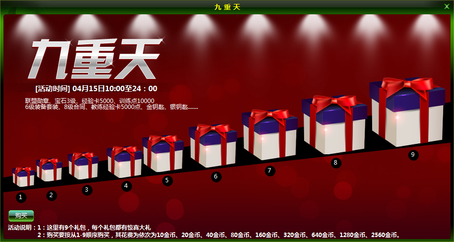 1、九重天活动有9款礼包,每个礼包都有惊喜大礼。玩家购买礼包要按从1-9顺序购买,其花费为依次为10金币、20金币、40金币、80金币、160金币、320金币、640金币、1280金币、2560金币。