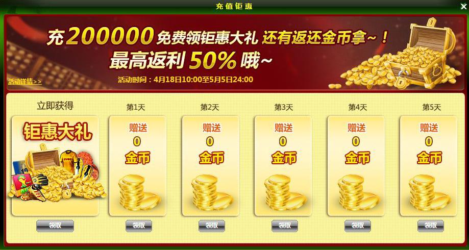 在充值活动期间玩家累计充值大于等于200000金币,返还充值金币额50%