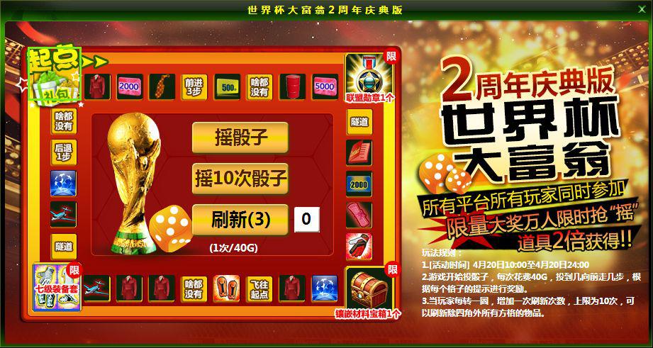 活动内容:在“世界杯大富翁”活动期间内,您仅需消耗40金币即可掷1次骰子,骰子显示几点就走几步。在世界杯大富翁之路上,除了有起点礼包,更有2倍获取全区全服限量投放的联盟勋章1个,镶嵌材料宝箱1个,7级装备套1个(不含袖标)哟! 全区全服限量的超级大礼,你一定不能错过机会。