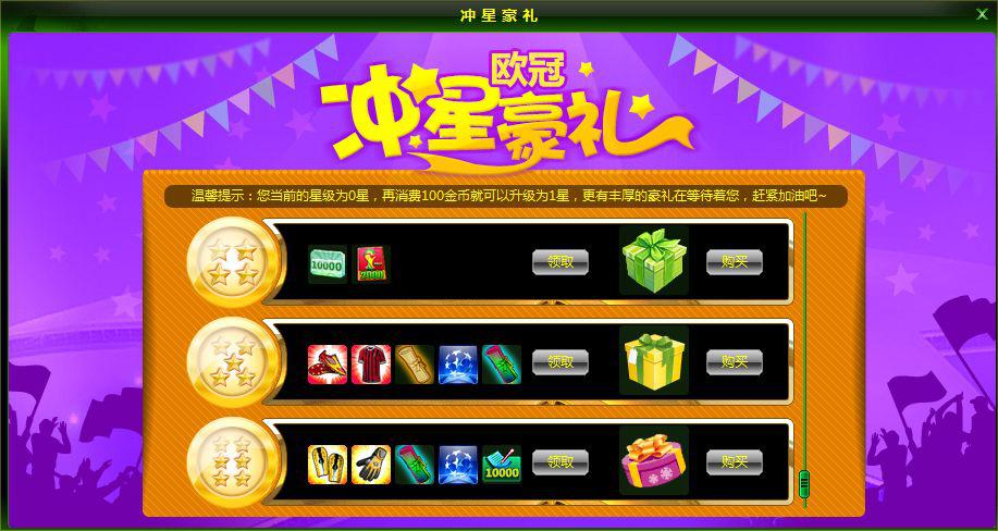 活动内容:在活动期间内,玩家通过消费金币达到不同的星级,可领取及购买相应星级大礼。身为VIP或单日消费满100金币即可品尝一星之礼美滋味。日消费6666金币不仅能领取6星礼及抢购6星礼包,并有满星大礼包呈献!