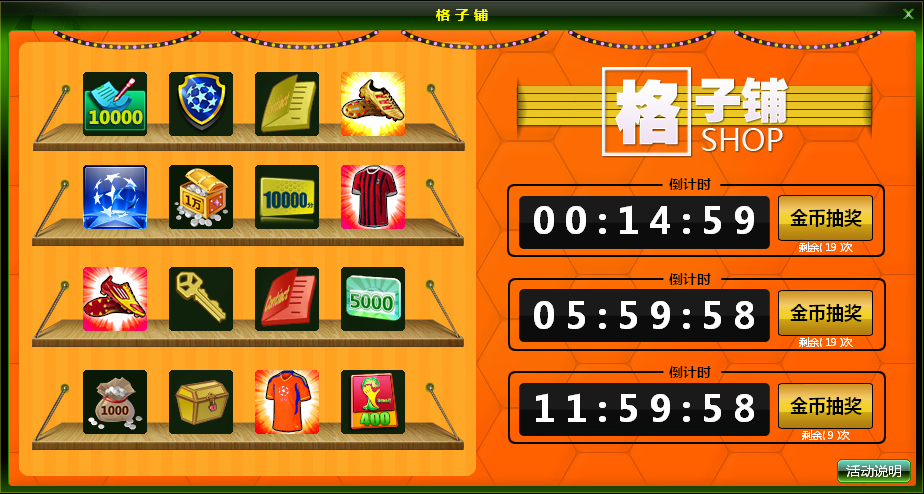 活动内容:活动期间内,格子铺设立3档抽奖,倒计时归0时,即可进行格子铺免费抽奖,格子铺为大家准备了精美大礼,欧冠勋章、欧冠之魂、银币兑换包(中)、金宝箱、战术积分卡、签名积分卡、世界杯积分卡等超级幸运奖期待你来抽取哦~分秒必争的你,如果不堪忍受等待之苦,也可以立即花一定量的金币进行抽奖哦!每日每人抽奖次数有限,机会难得哦!
