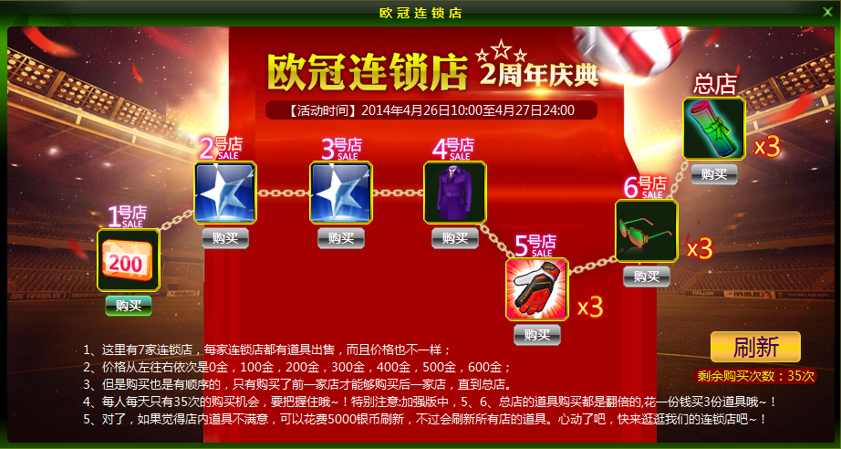 活动内容:在活动期间内,让我们一起涌入“欧冠连锁店”吧,界面中依次有7家店铺,每家店铺都出售一种道具。玩家按照店铺顺序购买,1号店道具免费购买喔~剩下的店铺需使用金币(活动券)购买道具。每人每天能购买35次呢~如果你对上架的道具不满意,还可以消耗5000银币刷新哟,说不定能刷出更好的道具呢~
