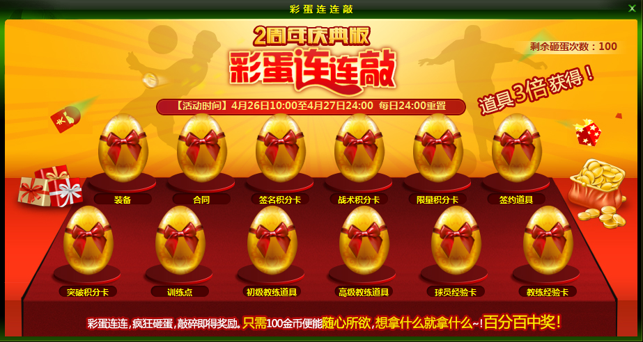 玩家每敲一颗蛋需要100金币,每个活动日每人最多只能敲100次,每次砸蛋奖励3倍道具。每个活动日的24:00进行重置。