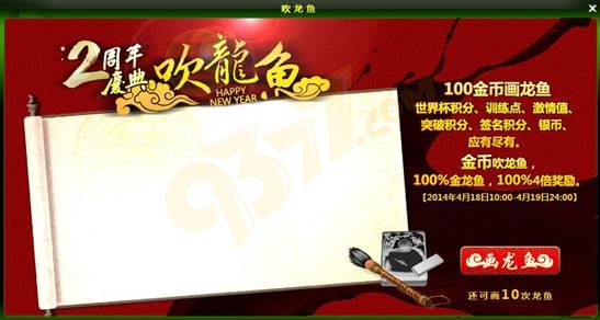 1、玩家每天可以画10条金龙鱼,每画1条金龙鱼消耗100金币。画金龙鱼可获世界杯积分100点,、训练点1000点、紫色激情40、橙色激情160、红色激情80、蓝色激情320、突破积分500点、签名积分500点,银币500。