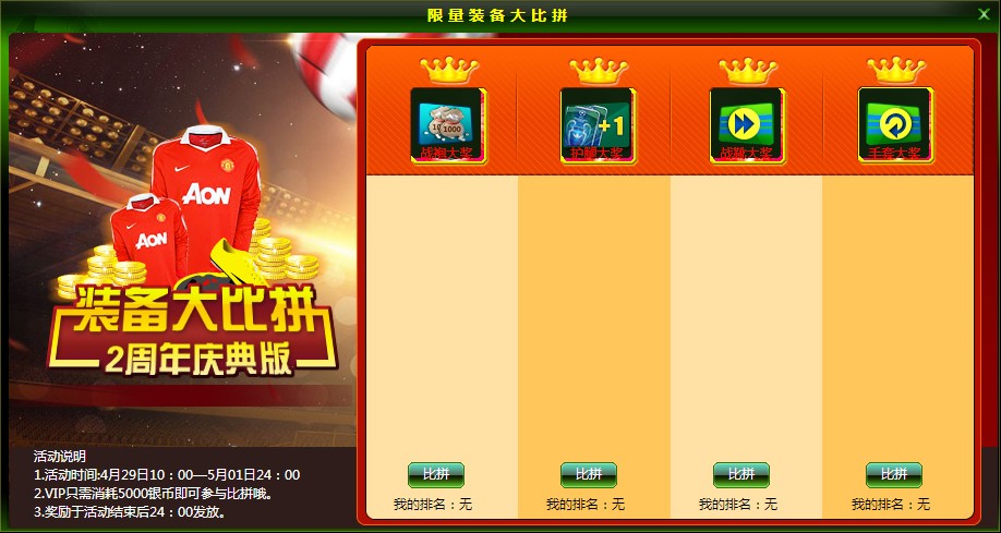 活动内容:在活动期间内,VIP功能的玩家一定要来参与限量装备大比拼活动。把自己6级、7级、8级限量装备拿出来炫耀一下,只需5000银币就可以报名比拼喽~谁的限量装备能夺得排行榜第一呢?榜首第一者奖励银币双倍卡、重翻次数卡、立即返回卡、跳过次数卡,还有专属球队头像及上线提示呢~