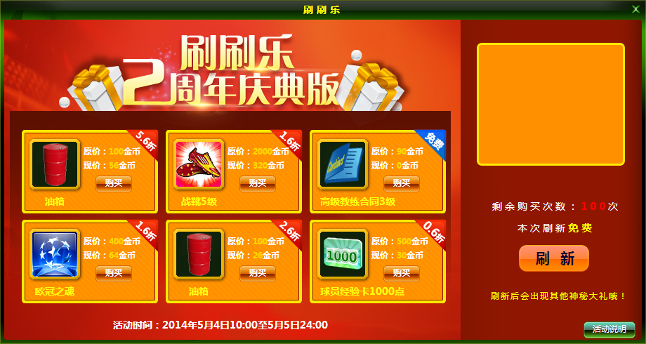 1、活动开启后,玩家点击“刷新”按钮可刷出6款随机道具及随机折扣,玩家有可能刷出免费购买道具的机会。