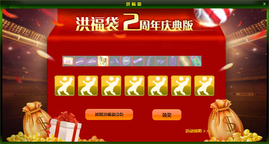 活动内容:活动期间内,快来“抓取洪福袋”!仅需50金币就可以开启洪福之旅,抓得洪福袋点亮道具奖励,更有欧冠之魂,8级合同,9级高教合同,9级高教装备等众多豪礼呢,道具均为2倍获得~心动不如行动,快来抓洪福袋!