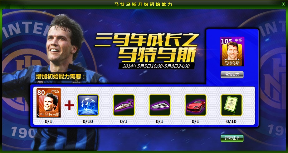 活动内容:在活动期间,玩家在活动界面内集齐一系列数量的道具就会点亮“增加实力”按钮,使当前玩家球队中的马特乌斯增加1点初始能力。
