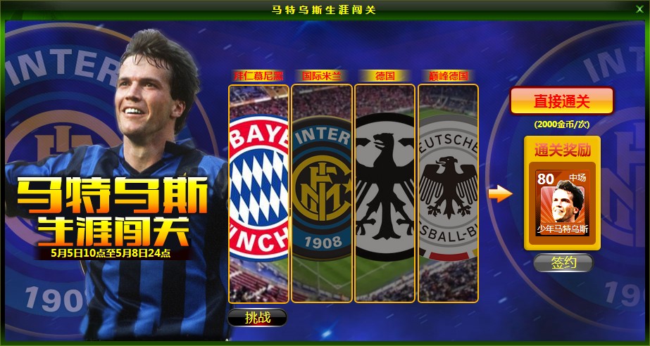若玩家通关一次后,可点击“直接通关”按钮直接通关,并获得成长证书*20、欧冠之魂*20、6级汽车*3、6级轮船*3、6级飞机*3、少年马特乌斯*3(直接发球员,请务必预留替补席空位)且刷新球员签约、副本挑战进度,每次直接通关消耗2000金币。
