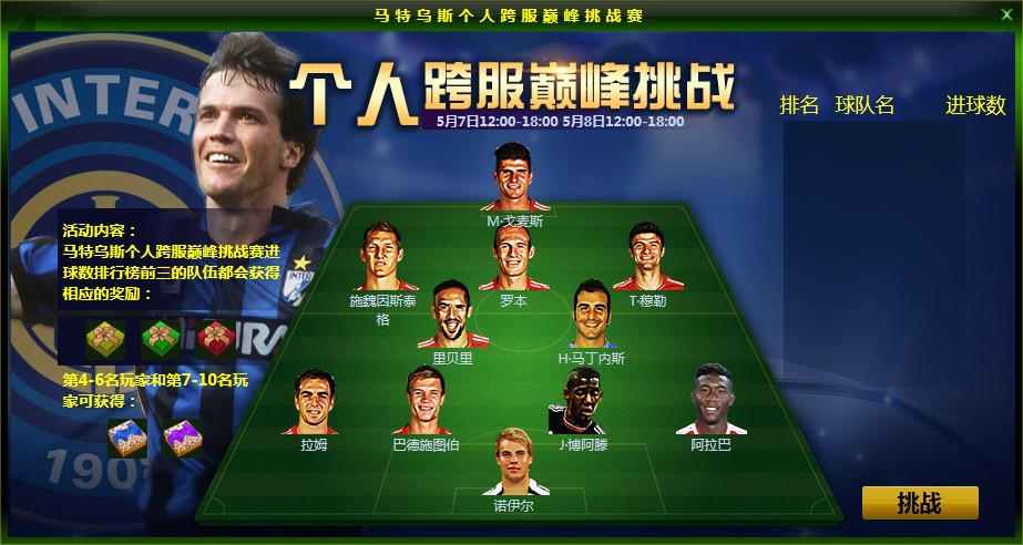温馨提示:挑战排名每5分钟同步一次。本活动对球会无进球贡献的玩家不会有任何奖励。
