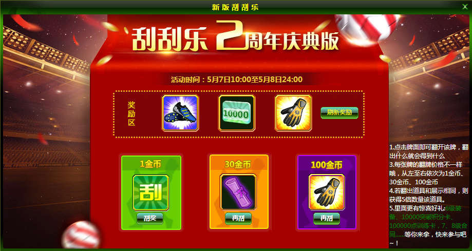 活动内容:在活动期间内,来刮刮乐翻牌,玩家最低仅需1金币就可以参与刮奖,好运连连刮得道具材料尽收囊中~8级合同,6级装备,6级袖标,世界杯积分,突破积分,战术积分等等豪华道具你来刮,刮开直接发奖励,更有获得5倍道具的机会哟~快来参与吧~!