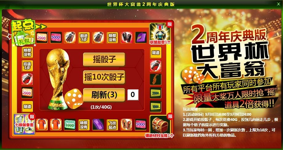 活动内容:在“世界杯大富翁”活动期间内,您仅需消耗40金币即可掷1次骰子,骰子显示几点就走几步。在世界杯大富翁之路上,除了有起点礼包,更有2倍获取全区全服限量投放的联盟勋章1个,镶嵌材料宝箱1个,7级装备套1个(不含袖标)哟! 全区全服限量的超级大礼,你一定不能错过机会。