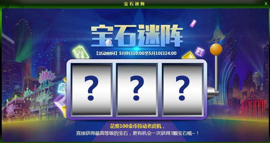活动内容:在活动期间内,赶紧抢宝石吧!玩家只需消耗100金币就能把光芒绽放的宝石摇出来!对,就是这么简单,1-4级宝石动动手指就搞定!你一定想都想不到吧,每摇50次必出一颗4级宝石。如此动心,还不快来宝石迷阵?当绿茵钻石王老五的感觉真是好极了!