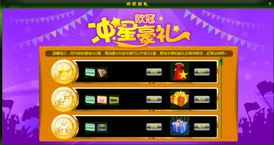 满星大礼包当日24:00以道具方式自动发放到玩家背包中,相应的积分也会直接添加在相应积分显示账下。欧冠冲星豪礼活动,玩家单日消费金币不包括在交易中心消费的金币哦~每个活动的24:00将进行重置。
