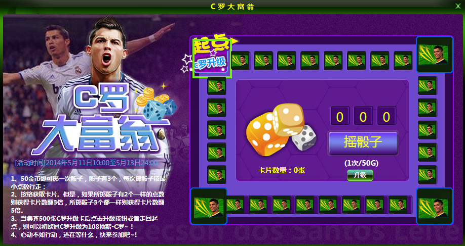 活动内容:在活动期间,在C罗大富翁活动中,玩家仅需花费50金币就掷出三个骰子,其中骰子最小的点数即为前进的步数,每一小格都有2张欧冠C罗升级卡,当然如果运气好落到除起点外的角落大格所获得的欧冠C罗升级卡会更多,当玩家拥有500张欧冠C罗升级卡就可以对球队中的初始能力106的欧冠C罗进行升级,升级后名称为顶薪·C罗,初始能力108。